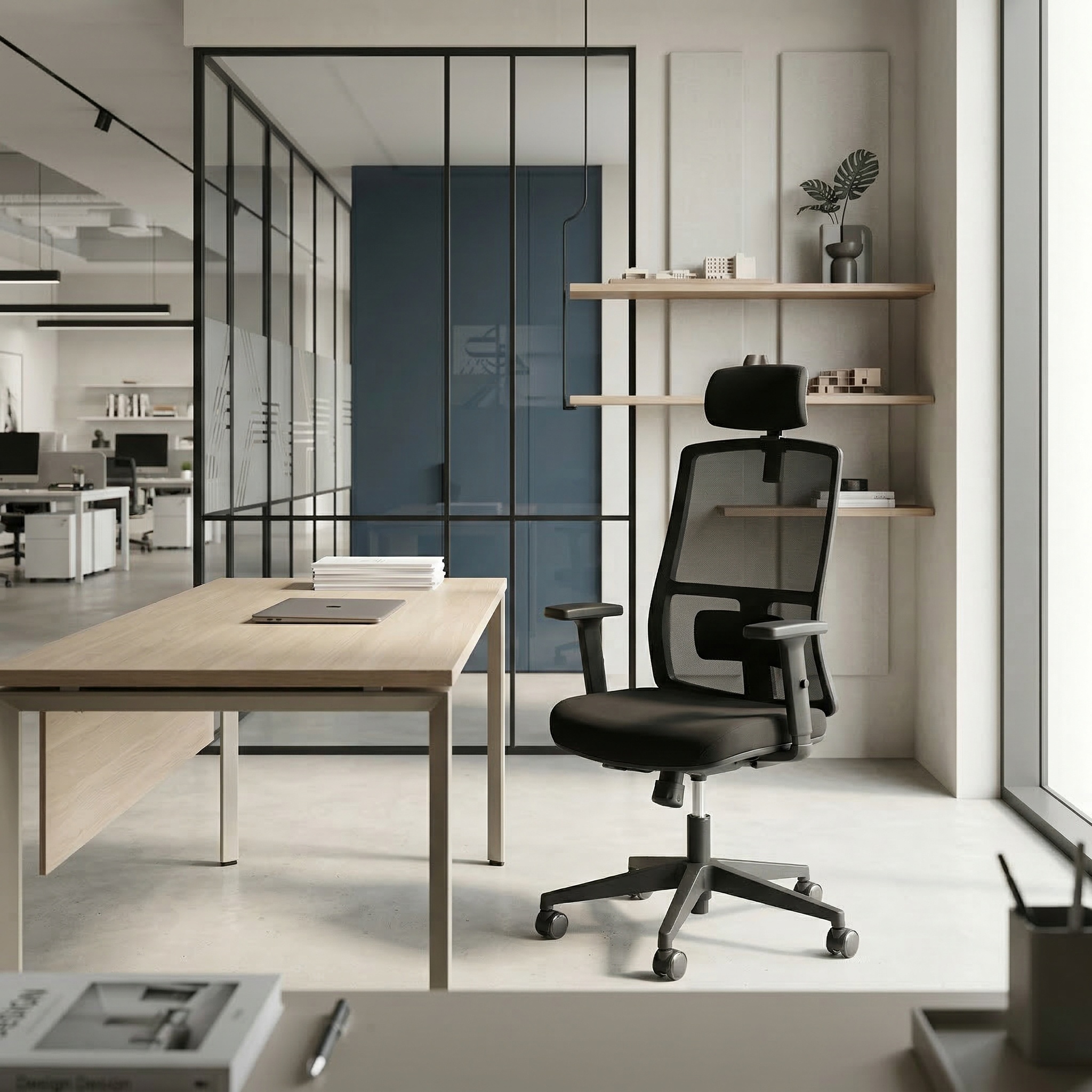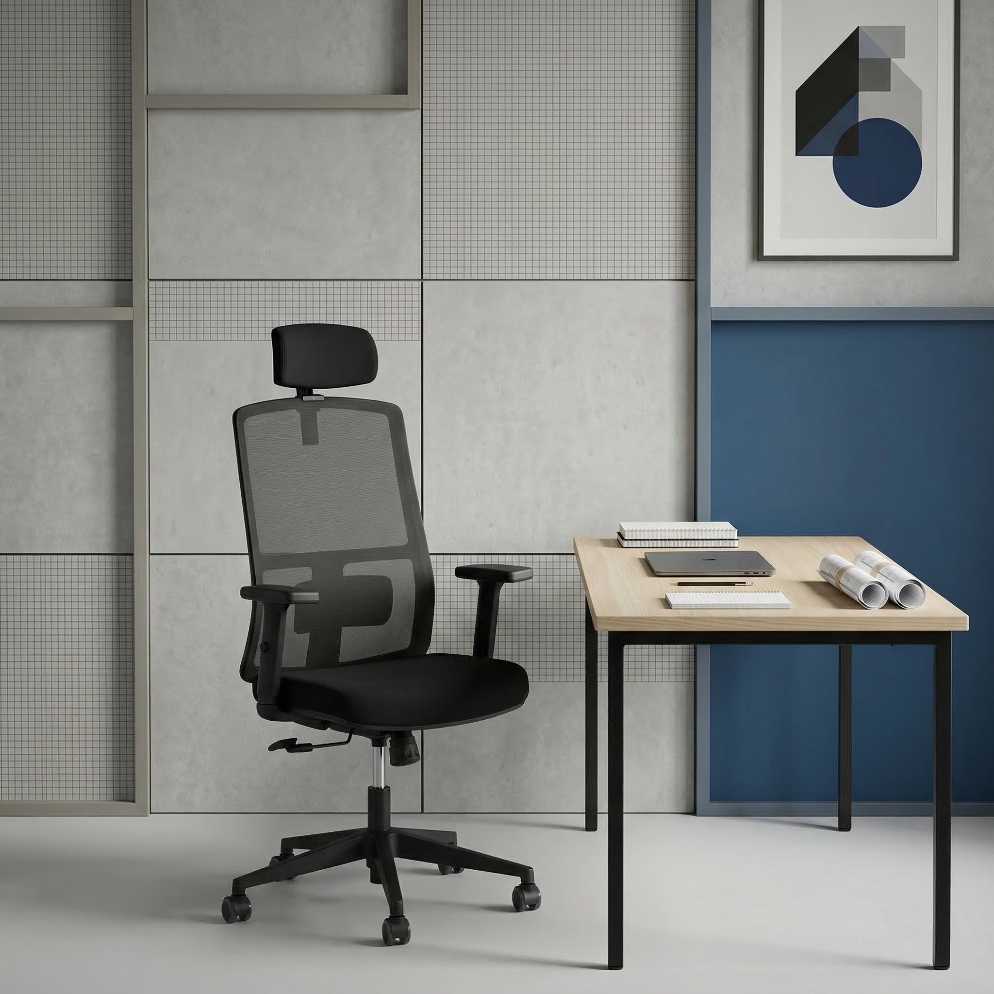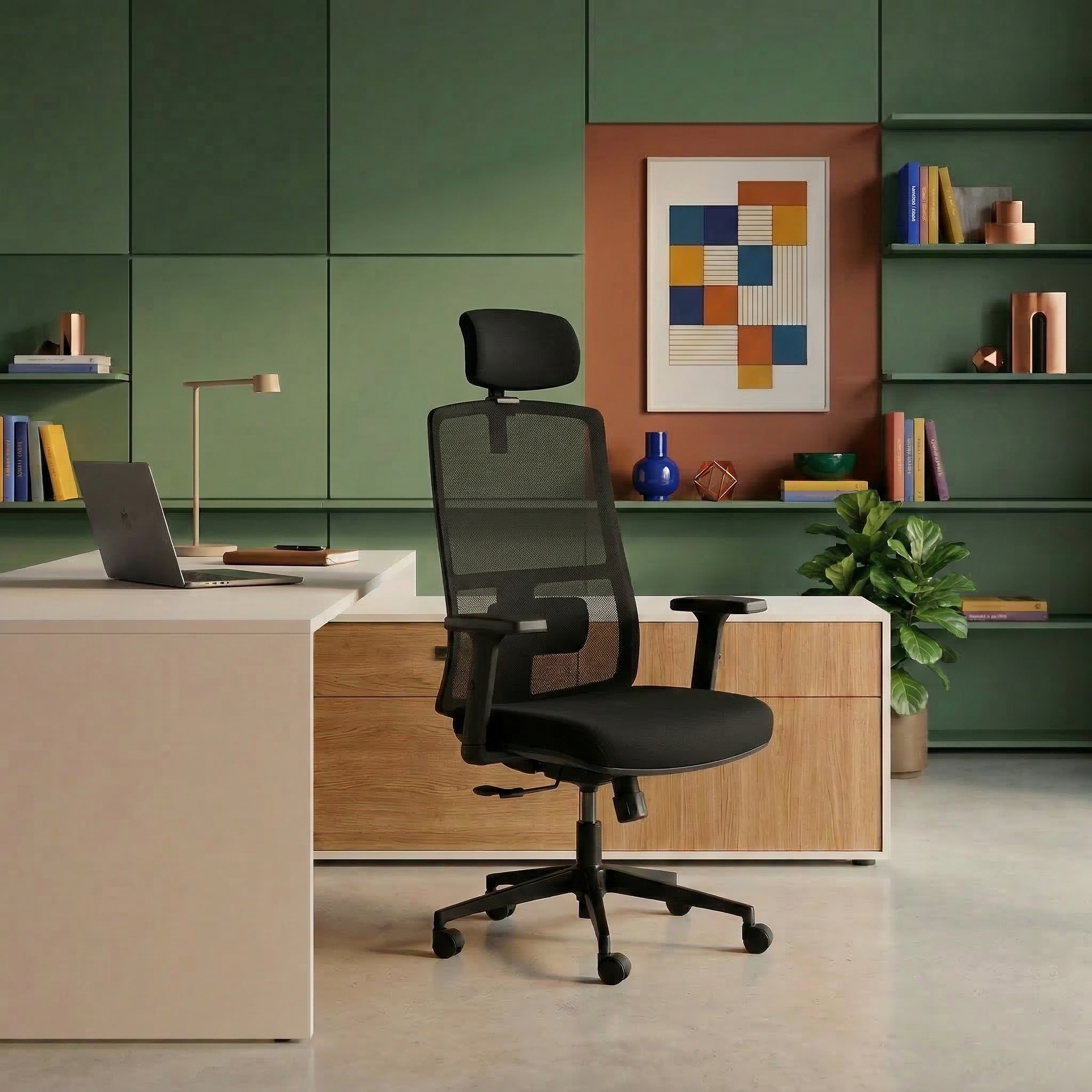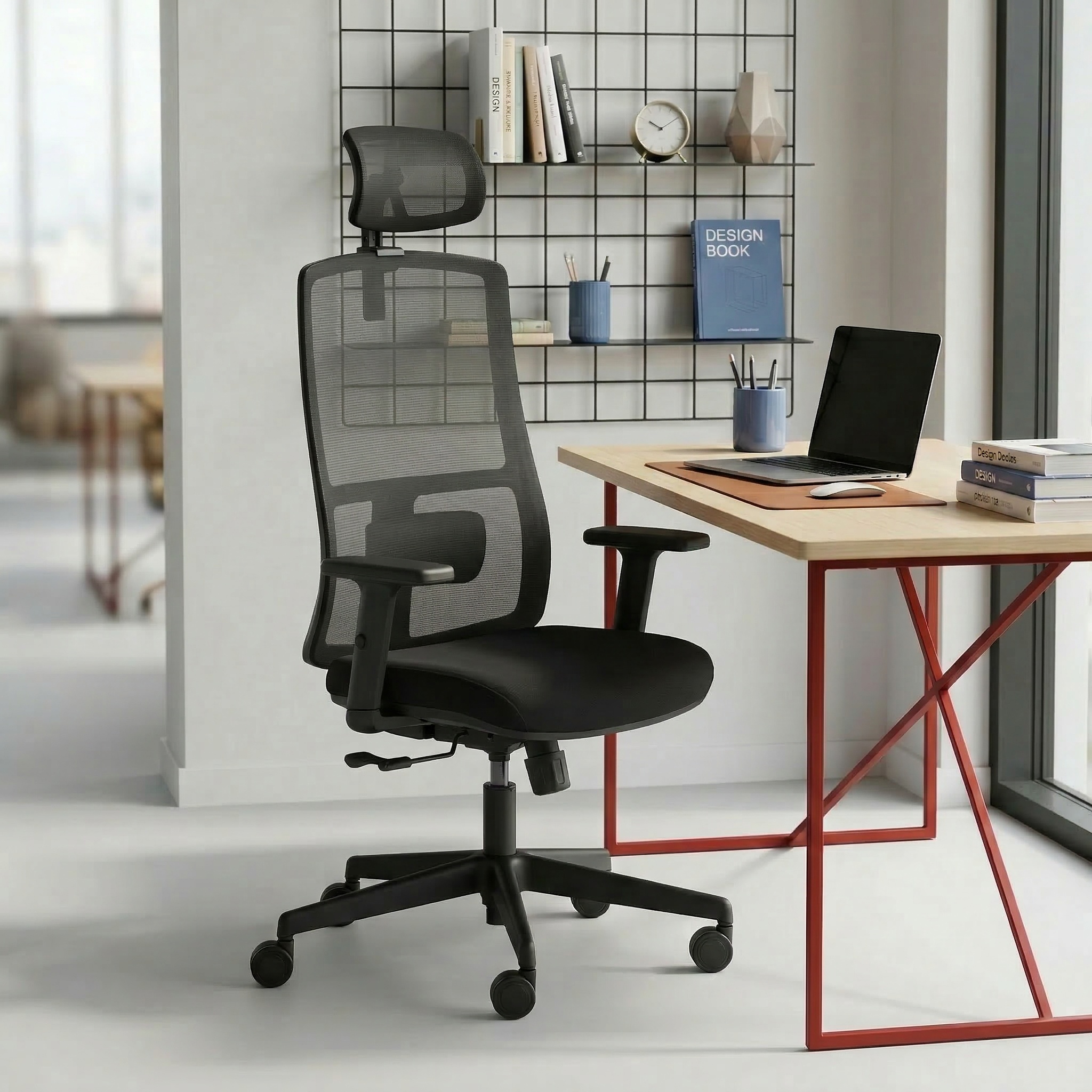 • כיסא מנהל ארגונומי עם מנגנון סינכרוני, תמיכה לומברית מתכווננת ומשענת ראש מתכווננת
